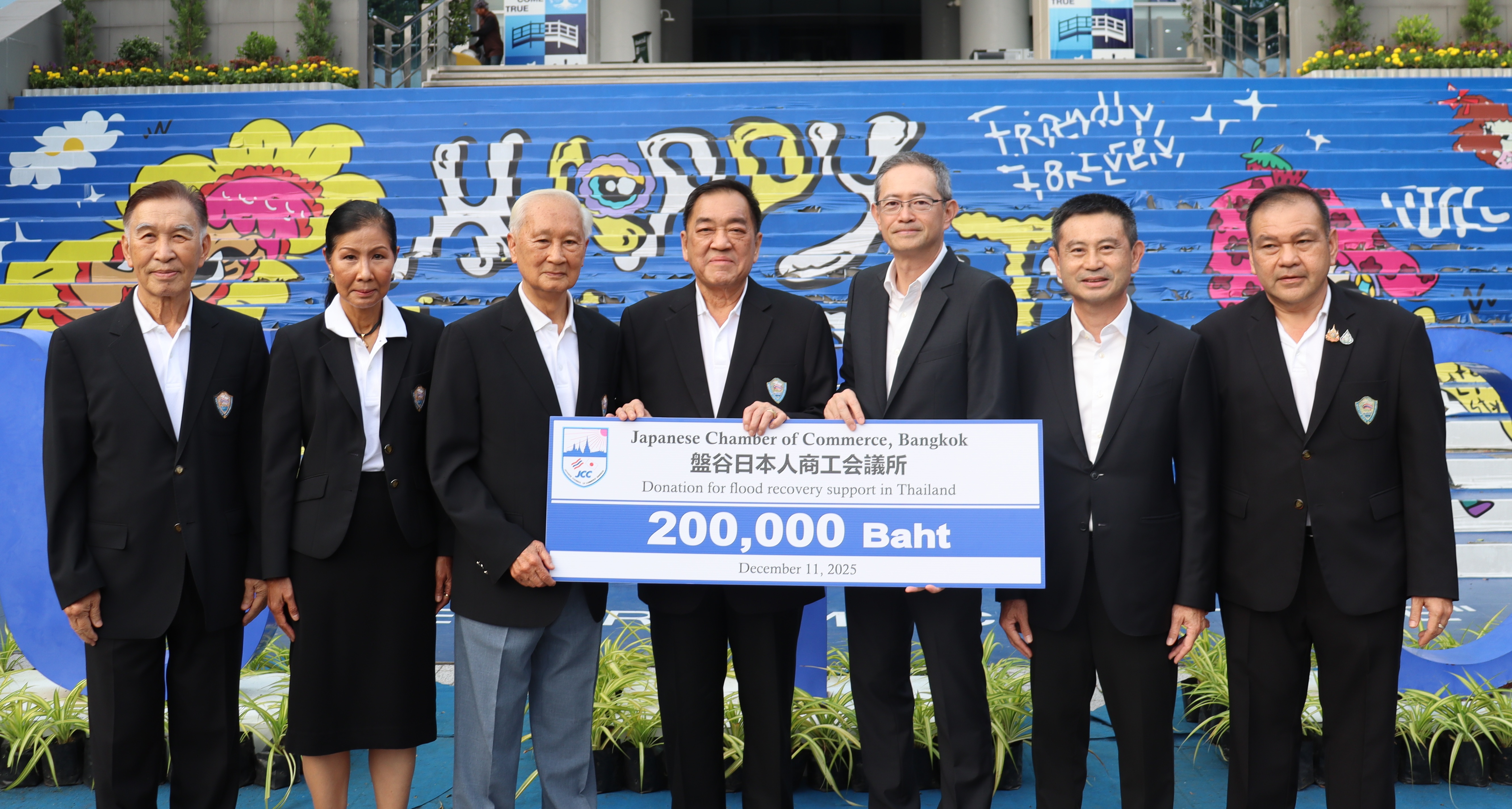 Mr. Sato personally presented the donation to Mr. Poj Aramwatananont, Chairman of the Thai Chamber of Commerce. The donated funds will be used to support the Chamber’s flood relief and reconstruction activities.